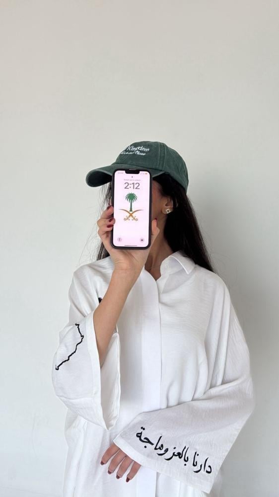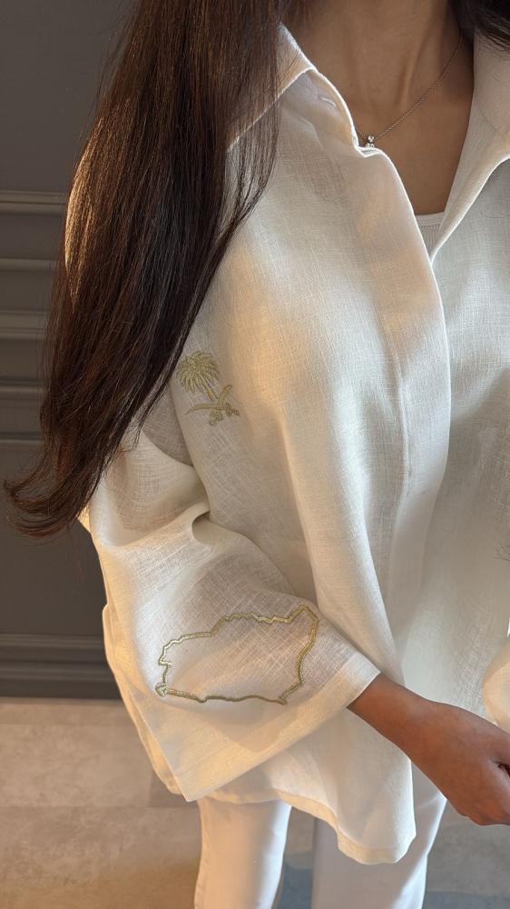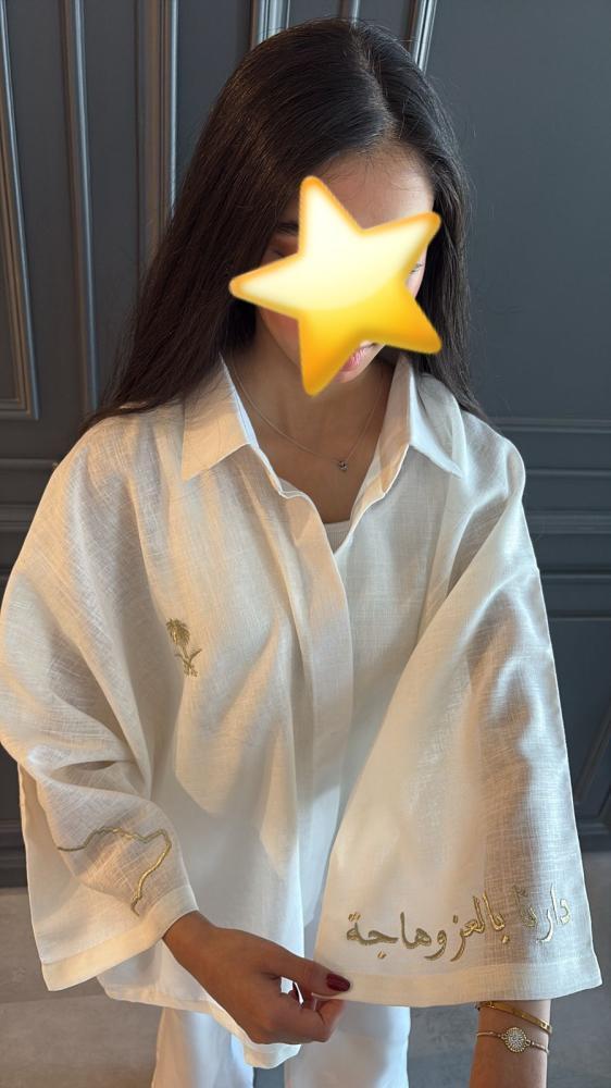 قميص لنن فري سايز للكباريحمل تطريز السيفين والنخلة من الاماموتطريز خريطة المملكة و عبارة ( دارنا بالعز وهاجه) على الاكمامملاحظة: القميص فري سايز يناسب من مقاس سمول الى ٤ اكس لارجالمنتج يتدرج تحت خيار تصميم حسب الطلب