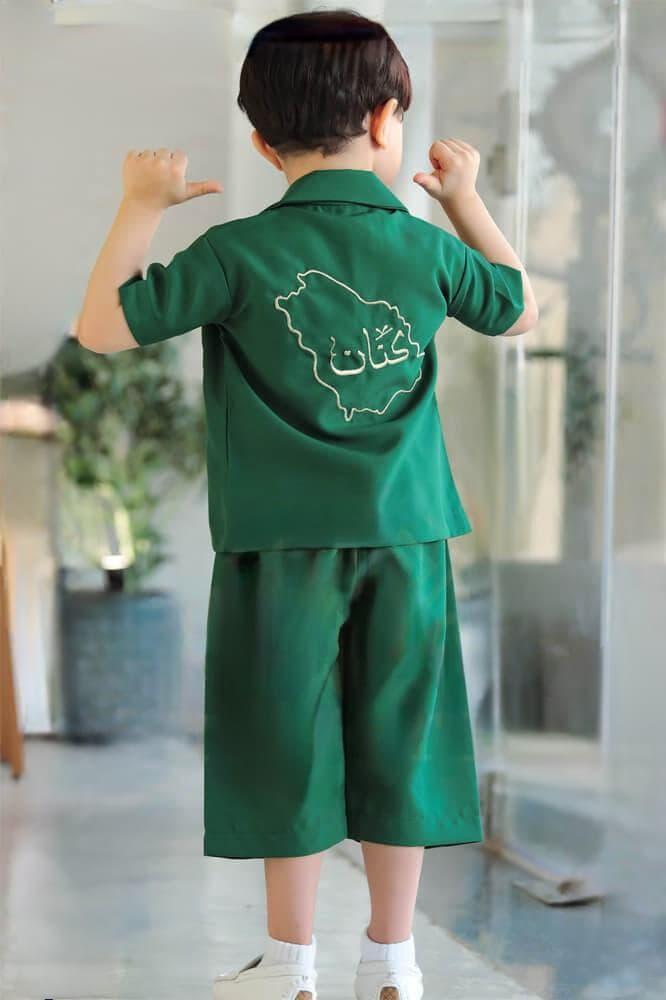 أحصلي الأن على طقم جاكيت برمودة اليوم الوطني بتصميم ملكي مميز باللونين الأخضر والأبيض بتطريز خريطة الوطن من الخلف مع شعار الهوية الوطنية من الأمام تطريز، مصنع من أجود أنواع الأقمشة ليناسب طفلك وليبدو أنيق بطلته الجميلة في اليوم الوطني